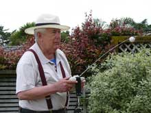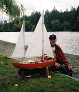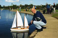 Rex has built the model plank on frame, timbers used being Kauri and Ash ply, the main sails controlled by winch arms, the fore sails static set. Being quite bluff in the bow the Belle Orlean seen in the first two photos above is not a fast boat but looks good on the water, particularly in a good breeze. He is seen with another of his boats in the third photograph, that one a ketch 850mm or 30” in length called Marlene built on a fiberglass hull to which the deck was replaced with a wood planked one, and kauri and mahogany cabins. A good little boat for windling that!