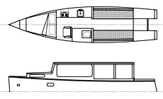 The main hull remained the same shape, but gained a raised foredeck for much more volume in the forward cabin, a nacelle beneath the main hull was added to carry the batteries, motor and prop shaft (other major changes were - a bow thruster was fitted, the cabin extended aft, the galley enlarged and much shifting of interior spaces - not one bulkhead from the original design remains in the same position).