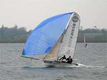 12ft skiff/Q-class - 12ft long ... hullweights around 90lbs in 4mm (5/32") plywood. Two crew on trapeze. Mainsail and Jib ... about 300 sqft ...spinnakers about 550sq ft.