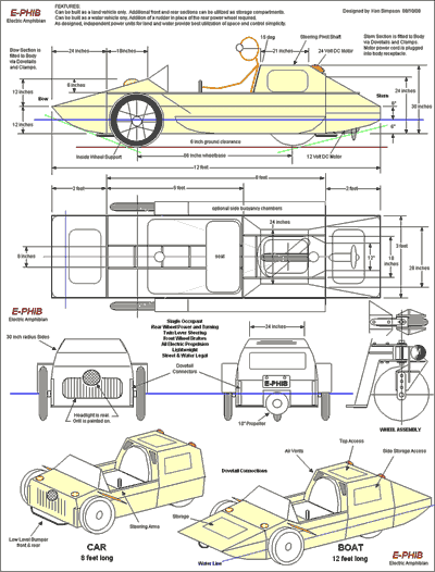 The vehicle is tentatively named E-PHIB, short for Electric Amphibian. Its intended use is for fun around a pond or small lake, or just a spin around town. It will travel on land, sans the water appendages, at about 15 MPH, for a distance of 15 miles, when fully charged. It will be powered by a 600 watt 24 volt scooter motor. Later, larger motors can be retrofitted, if desired. On water it will go at hull speed, which is about 5 MPH, powered by a 12 volt trolling motor head. Water distance should be about 8 to10 miles, round trip.
