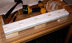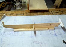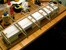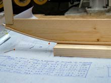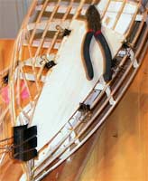 The next photo shows the frames on the strongback. On the right you can also just barely see the stem, installed on an extension whose dimensions are given on the plans. Frames were installed with half-inch, 19-gauge nails through pre-drilled holes in the cross pieces, not glued. This part is a real test for the fumble-fingered; I had more success pushing the nails into place with needle-nose pliers than with hammering., which tends to knock the blocks loose from the strongback. A notched backer stick big enough to get a good grip on (not shown) kept me from knocking the whole model on the floor while I was forcing the nails in.