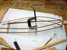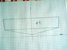Since I was working from plans--this first model was based on the Applegarth sailing skiff on p. 54 of the Cheaspeake Bay Maritime Museum’s A Heritage in Wood--with no “developed” shapes for the sides, I decided that I could get a rough three-dimensional idea of the hull lines by lofting a scale model mold, stem and transom from the plans, then bending the gunwales and chines around these forms. For the mold shape I used the station measurements at the widest part of the hull, lofted onto graph paper in the same inch-and-a-half-to-the-foot scale as the Hartley model. The developed transom was drawn the same way.