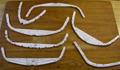 After a bit of playing with the magnification on the copier, I was able to produce properly scaled drawings for my model. These I pasted onto scraps of thin plywood paneling and cut out on the band saw. The resulting scale-model frames and stem are shown below: