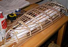 Now the planking went on. Here I used balsa instead of basswood for its greater flexibility. This photo didn’t turn out very well, but you can see the great lengths I had to go to to hold the planking in place while the glue dried.
