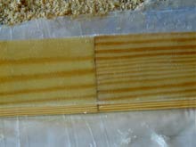 Next, I used the female template to trace the top radius of the transom, and constructed that piece as a sandwich of my one-inch yellow pine between two sheets of half-inch AC, for a total thickness of two inches, glassed on both sides. Note the high quality of the AC ply: |