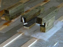 Here’s what I actually did to make these joints: After painting the ends to be joined and about two feet back with unthickened epoxy, I laid plastic sheeting down on the garage floor, positioned the three layers of “bottom” tape and saturated them with slightly thickened (with wood flour--to keep it from just draining away) epoxy, positioned the joining pieces of wood on top of the tape, and then applied the three remaining “top” layers of tape with the slightly thickened epoxy.