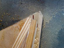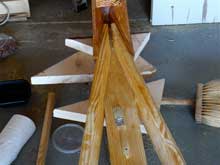Next the halves were pulled apart and the wedges buttered with Titebond III and driven into place. If you’ve ever tried to hang a multi-hinged door that’s warped enough so that the hinges don’t line up right, you’ll know that the plywood doesn’t want to be forced into this shape. I’m convinced that the “torturing” of the plywood this way actually makes the resulting structure stronger, but it makes for some interesting assembly quirks--like one little wooden wedge being spit out and flung across the room. while you’re trying to get the next one into place. Wear safety glasses and be prepared to duck, and drill some holes in the plywood where the wedges are going to go, for temporary screws or nails to hold them in place while the glue dries. You can just barely see the nails in this photo. |
