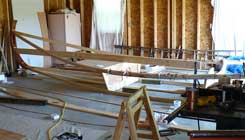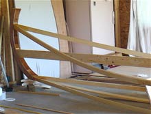 The boat began to take shape as the longitudinals were bent around the mold and fastened to the transom. |
