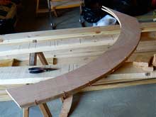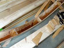 The gunwales presented a different challenge. The complex curve of the sheer makes them misbehave. The photo shows what they want to do when you spring them into place. Even I know that this isn’t good enough. |