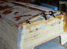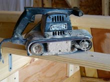 Once the epoxy had set up, I had to shape the keelson to accept the bottom panels. To get the proper angle I just laid a stick between the chine and keelson, then removed material with 50-grit paper on my antique Craftsman belt sander until the stick would lie flat. The last time I did this I used a power planer; the sander IMHO is much more easily controllable.