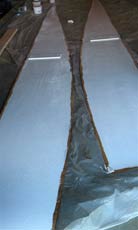 Once all the edges of the bottom planking had been shaped, filled and taped, the outer layer of the transom was applied and glassed. |