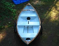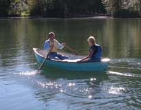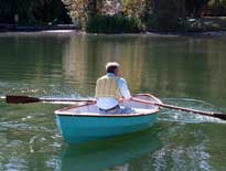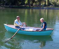 On this boat, and my next boat, the 12ft Granville Bay, the "two up" rowing position is at the forward seat. The Granville Bay and the O&P, both have reduced volumes in the ends, so the people weight has to be spread out over the hull. More so than my Pram designs, which have a lot of volume in the stern areas. After Nick moved the oars to the forward position, I helped Edie get into the boat, and off they went.