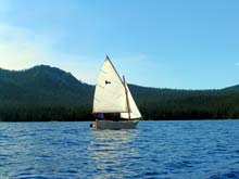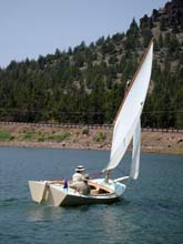 The centerboard and rudder both kick up so, combined with her flat dory bottom, Pacific Pelican is easy to beach. Gunkholing with only 5” draft (board up, of course) is easily done. She can go from a fast rough water cruiser to a laid back pleasure barge without any changes other than adjustment of rig and centeboard.