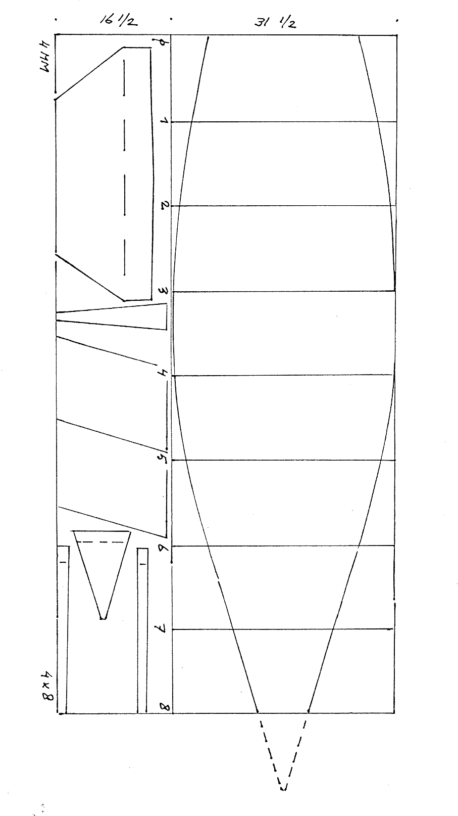 The bottom side of the panel is 21 3/4”long; the gunwale side is 35-¾”, which is about the width of the boat at the stern. The entire height (without folding) of the panel is 13 1/8”, but add a camber of at least ½”to the top of the panel for better looks. The chine fold is 9 ¾”from the bottom of the panel.