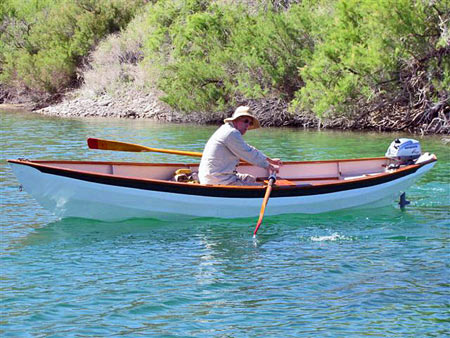 Provision may be made to use a small outboard motor - 3 or 4 horsepower is about the maximum, more would be overpowered. This is no speedboat.