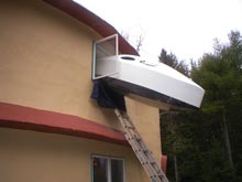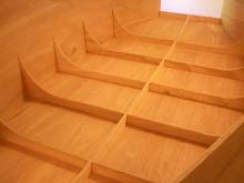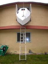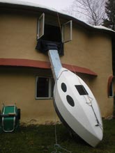 Huh? You must be wondering how an oceangoing boat can be built so small and light. Well, the secret is in the power supply. This boat does not have a conventional sail rig: mast, boom, etc. It relies on kites flown from heavy line to provide the energy to move the boat through the water. The kites vary from simple single line parafoils for broad reaching and running, to complex and efficient four line ram air kites for beam and close reaching. They will be flown from a point on the leeward rail as close to the water line as possible. This virtually eliminates heeling and the need for a large and heavy keel to provide righting force. Therefore the boat can be built to be much lighter than a conventional sailboat, without all the necessary reinforcement to provide attachment points for a keel and mast.