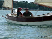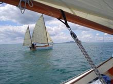 We soon ran into John Welsford again, Chuck & Sandra Leinweber of Duckworks fame, Dave Perrillo, Paul Groom and lots of other people, all enjoying the sunshine and the boats. We entered the Te Haupa Trophy race which was to start at 1:30. The race course was from Sullivans Bay, out through the mouth of the estuary, around Saddle Island then back to a mark off Scotts Point and back to the finish line at Sullivans Bay. Other races were also held over the same course, for Frostbites, traditional boats, modern classics, launches and so on, with the larger boats doing two circuits. Chuck and Dave joined me on Varuna for the race, Blair sailed Jaunty with a friend crewing, and John Welsford joined John and Caroline Leathwick on their Navigator Hau tai. There were several other Welsford boats racing, the Rogue and Golden Bay among them. It was a great experience to be racing alongside and amongst boats ranging from A class keelers to classic yachts and launches, and a host of other assorted craft.