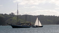 We had about 10 miles to sail down the East Coast Bays, and with an off-shore SW wind rising to 15 knot later forecast, were looking forward to a nice close reach to finish the trip, with plenty of other boats for company. We spent some time at the start taking photo's of each others boats sailing (it's always hard to get shots of your own boat under way). We then settled back to enjoy the morning, and very pleasant it turned out to be. The wind freshened a bit around mid-day, and by the time we got to Blairs destination it was blowing quite hard again. We left Blair to it, and continued on for the last couple of miles of our trip alone. We ended up having another quite busy sail, the wind was reported as gusting to near 30 knots at Bean Rock as we got close to North Head. The strong wind and all the regatta traffic, as well as the spectator boats and large ferries, meant we had our hands quite full again. We were finally ashore and packed up by about 4pm, and off towards home after another great trip.
