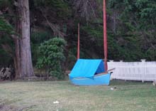 I was awake early next morning, and waded ashore for a quiet wander around. I came across Marcus camped on the lawn near the marquee in his Golden Bay 'Riha', he was still fast asleep under his little boom tent in what must be one of the smallest camp-cruisers around.