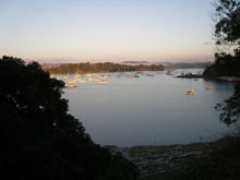 We set off a few minutes behind Jaunty, and sailed around the expanse of rocks and reefs north of Army Bay, then on a long tack through the passage. We started out on this leg wearing T-shirts, but before we had gone far the wind started to rise, and we began to encounter a short steep chop that had Varuna shovelling the occasional bucket full of water over the bow and all over us. We were soon reaching for our waterproof jackets and by the time we were ready to tack again we were very glad to have them on. The wind continued to rise and soon the bowsprit was pointing skywards one moment, and then plumeting into the trough of the next wave a moment later. We tacked too early, and the outgoing tide carried us back towards the headland we were trying to round, the next pair of tacks were not much better and it seemed to take forever to get out of the rough area at the southern end of the passage. When we did, the waves moderated a little, but the wind was now gusting very strongly, and the bailing wench was busy. Varuna as usual handled the conditions magnificently, but we were approaching the edge of our comfort zone. Jaunty was still ahead of us whenever we crossed tacks, and looking very small and vulnerable as we tacked towards our destination. We took one long tack away from the peninsular, and crossed much closer to Jaunty on the next one. I thought we had done well, until later when Blair told us he had shipped a lot of water over the gunwhale, and had stopped to bail out and put in a reef. As the day died we got closer to the mouth of the Weiti River on which Stillwater is located, the wind started to drop a bit and the waves died down. We were very happy to be able to heave to and drop the sails alongside Jaunty when we reached the river mouth, and we motored together into the peace and calm of the river. A mile or two upstream we pulled in and went ashore on the boatramp near the Stillwater Boat Club. It was 8pm and there were a few members having a drink on the balcony at the club. I wandered over and asked if there was any chance of getting a meal. What a great welcome we got there. Half an hour later we had the boats tied up for the night at the club's loading pontoon, I had a cold beer in my hand, and we were all tucking into superb fillet steaks with mushrooms, salad and chips. They were a bit apologetic that that was the only meal available at that time of night, but we would have been happy with baked beans on toast.