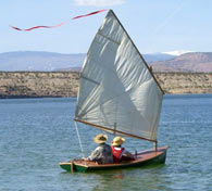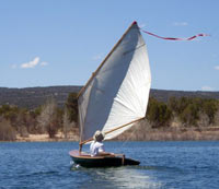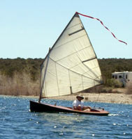 | I finished mine in the style of a Melonseed. She sails great, can fit 2 adults in a pinch. I intended her for teaching the kids to sail in. The sail rig has 3 - 8 foot cedar spars that are light and stow inside the cockpit and under the deck, enabling it to be rowed comfortably. |