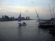 At sunset on Monday night we were still missing one boat - the Miller family, but the next morning there was no sign of the Millers but there was a new one - a Bolger Martha Jane. On it were George Broadlick and his sons, David and James who told us that they had helped the Millers recover from a capsize and that they were just down the way.