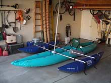 I bought the smallest fishing pontoon boat I could find and reinvented the pontoons as amas. They were larger than I would have preferred – I was concerned about too much wetted surface - but they were the most readily available option. I’ve seen smaller inflatable amas for sale on the internet, but in the demo videos they usually seem to be more or less submerged much of the time, which doesn’t strike me as the best low-drag option, either. Once I had the pontoons inflated and sitting alongside the kayak they didn’t look bad, but they were big, so now I was more concerned about windage. As an option, I designed the akas (cross-beams) so that either ama could be removed, converting the boat into an impromptu proa. Fortunately, most of the T200 will be more or less downhill, so windage shouldn’t be a disadvantage for most of the course.