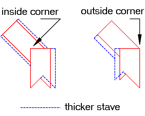 On the modified version, the outside corner is flush with the outside tip of the “V” groove. If you use a thicker stave, all the extra thickness is added to the inside. The stave's thickness no longer has an effect on the overall diameter. The stave's width alone sets the size. And since the outside shape is a simple regular polygon, the formula for size becomes quite simple, compared to the original birdsmouth.