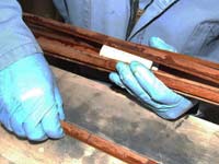 | Lightly reclamp strips together v-groves up and mix epoxy. First spread a coat of neat epoxy in grooves followed by epoxy thickened with wood flour to the consistency of thick syrup. |