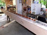 | However the v-grove is done, then rip the strips to 9/16” wide, this will finish out to a shaft 1-3/8” diameter, so if you want a thinner shaft go maybe 1/32” narrower, a little bit goes a long ways here. The next step requires a seven to eight foot long flat space, a good 2x4 or 2x6 will work. Clamp all eight strips together, v-groves down getting strips aligned as best you can. Taper both ends down to 5/16” or a little less, leaving the middle 32” or so parallel, a power plane is handy here. Then lightly sand planed area to open the grain. |