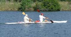 The picture on the left shows Jeff Jouett with his new two pound mahogany double blade with s.s. ferrule from Duckworks next to yours truly and my old pound and a half double blade made from Quam, a Central American wood with a density somewhere between Western Red Cedar and Balsa. The paddle may be light but it’s tough enough to have seen me through close to a thousand river/creek miles so far and the paddle’s probably in better shape than the paddler.