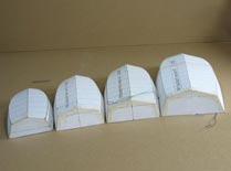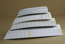 But looking daily at the 14ft model hanging in my kitchen on a string after I have had a few hundred breakfasts, it too may take on a sag in the side panels. I would only have to make the layout panels a couple of inches wider, and I could add some nice curve to the lines. I would just need a longer lofting batten, and not have to worry so much about getting the scarffed edges of the plywood to line up. I could be off an inch and still be able to cut out curved panels.