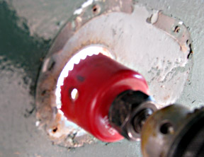 | Before the layers can be mounted, you need to drill a hole. Since it fit the inner opening, I used a 1 ½” hole saw. |