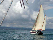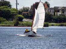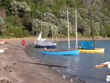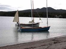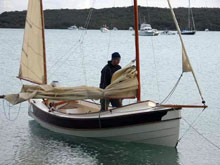 Summertime in New Zealand is cruising time, to be sure, but it’s also regatta time, with several major events held in cities as diverse as Wellington, Nelson, and Auckland. On the anniversary of Auckland’s founding, boats gather at Scott’s Landing for the Mahurangi Classic Boat Regatta. In 2006, 14 Welsford cruising dinghies lined up at the beach in front of the regatta committee’s headquarters. Among them, Jaunty, a 14-ft Navigator owned by Dave Perillo. Light-blue Jaunty is Dave’s second Navigator. His first one, Margaret H, was left behind in Fiji, where Dave cruised her for 10 months.