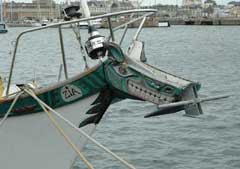 | Sinbad was the boat's name, the namesake 'figurehead' a little undignified wearing the masking tape of a partly completed refinishing job. |