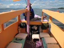 What I found that launch day is that I LOVE to stand on a boat, and this one is so stable there has never been a problem. I had built a cookbox sized to fit T2’s aisle that I could stand on in the stern. I steer by manipulating the tiller with my feet and ankles while holding onto the aisle rails. Usually the mate sits on the front deck (so much for keeping crew weight low). But launch day brought only a puff of wind, so although we raised the sail once, we brought it down within a half hour as all we did was drift downstream. Motoring is a little clutzy, as all the controls are on the small outboard, but the best way to steer is to lock the motor forward and steer the boat with the tiller. Steering and say, shutting off the motor are not tasks that can be done simultaneously by one person, something that would prove challenging in docking situations.