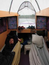 We spent some time cobbling together the camping top. We brought four PVC hoops preshaped to fit the aisle, then added polytarp over and bug net draped at the ends. How wonderful to be able to walk upright in the cabin. |