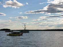 Yet there were constant challenges. T2 would not point up into the wind and stay there while we worked to set up the sail. Only by using the motor could we stay head to wind to set, reef, or remove sail – a really dangerous situation as the winds arose in the afternoon. Again, the mizzensail to the rescue – or not, due to my mistake. We finally took to using the sail only in carefully chosen moments, and motored the rest of the time. Taking a break was difficult. We couldn’t anchor without getting seasick from the swaying, we couldn’t beach without constant vigilance, and floating dockspace was at a premium. We stayed one night at a B&B and left T2 on a mooring to swing without passengers. We ate a couple of times at restaurants just because we could tie up at their docks for awhile. We stopped on some beaches but could not stray far for need of adjusting anchors. Sometimes we just stopped mid-bay, but then we always had to be on the lookout for lobster buoys and boats, which are everywhere. We were pushed at by winds, by tides, and by powerful river currents dissipating slowly into the sea.