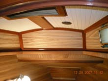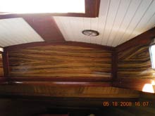 These days we are working on some cosmetic enhancements – we’ve added zebra wood veneer which we put in by first making poster board templates; cutting the veneer and gluing it with spray adhesive. We’re up to 10 coats of varnish and nearing the finishing point. We chose zebra wood for its beauty and because the table in the main cabin is made from it.