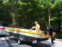 First of all, this is not the Conestoga found in my plans. The basic idea is there, but with a number of changes. First of all, the beam is four feet, not five feet, and sleep-aboard capability was eliminated. Using a width the same as that of a sheet of plywood made the design much simpler. Also, I went with a more conventional powerplant. It moves along nicely with either my Minnkota 40lb. thrust tolling motor, or my 5HP Briggs and Stratton outboard. There should be room, however, if I ever want to try the gasoline-electric drive I proposed in the contest. In place of the foot well I placed in the sleeping cabin, I put a locker.