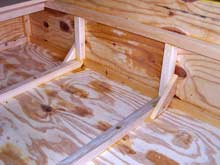 I kept the self-draining forward deck and motor well. It was framed with lumberyard boards, with the sides and bulkheads made from ¼ inch plywood, and the bottom made from 3/8’s. This resulted in a flimsy bottom, but the solution was fortuitous; longitudinal runners on the bottom, along with 2x2 framing on the inside gave me the rigidity I needed, and the bright-finished douglas fir runners look beautiful.