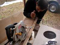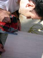 | Olivier makes the first cuts with a jigsaw. Later we went to a circular saw with the blade set just keep enough to go through the ply and found that faster, just as accurate and with smoother curves. |