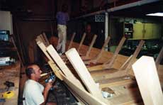 Whether or not to fiberglass the bottom of the boat was a controversial issue with us right from the start of construction. Initially, we decided to stay pure to 18th century construction and go all natural wood. In other words, no glass applications – the wood and caulking would have to hold the water, in and out.
