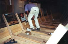 In 2003, for the sake of maintaining the integrity of the hull, we decided to fiberglass the bottom up and around the garboard and up to the edge of the first strake. |