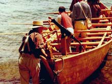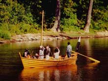 We took First Place in the Dark Island International Race 2001, Mallorytown, Ont. (before fiber-glassing, and we carried 6 crewmen and 2 passengers on board, plus sail rigging and a swivel gun). Five other bateaux participated. In this race, we started from the beach in Mallorytown, rowed across the St. Lawrence River crossing the international border to the US side (probably broke some rules there since we had a swivel gun mounted on board) and around Dark Island, a small island that features a huge castle-like mansion. The total round trip was about seven miles and several hours. The crew was really pooped but we were about 500 yards ahead of the second boat and we made a grand finish with the sail up.