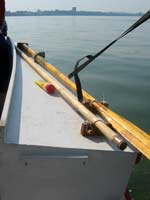 Before I entered the jointed era, my poles were terribly in the way. On the light schooner it used up the side deck on one side and made sitting uncomfortable. It was worse in my AF4B, demanding centerline space and most of the inhabitable length of the boat! There I was constantly tripping over it. Paradoxically it was almost worst in Polepunt. It would fit diagonally in the long cockpit—only slightly inconvenient for immobile adults, but the kids and dog were obliged to constantly climb over it. Even without the fancy chocks seen above, the jointed version lays happily out of the way along almost any chine. The joint does sacrifice some strength, but I think it’s worthwhile. A stronger pole doesn’t do any good if I leave it at home because I have no good place for it.