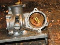 Since we’re looking at restrictor plates, there’s no throttle plate either. This one uses a rotating drum in place of a plate. Here is a side view open…