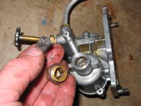 If the float doesn’t’ float, it can’t close the float valve to shut off the fuel flow. Too much fuel wells up into the carb throat and chokes the motor out – too rich of a mixture to burn. Remember the symptom the seller described? The motor runs fine for 5 seconds because the extra fuel acts like a choke, which a cold motor needs to get started. But it wants that choke shut off as soon as it starts running. In this case the float is the choke. A little arm holds the float down when you turn the single mixture screw to the “prime” position. This lets extra fuel enter. So rather than restricting air like we’re used to, this motor adds fuel.