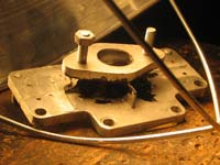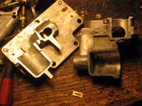 Then I take off the top of the float bowl. Here we can see the primary culprit. This motor has a sunken float.