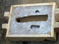 After screeding off the excess we add the bottom board and flip the drag over, then remove the follow board. Now is a good time to make an indentation where you will want your sprue. In this case I didn’t bother, because I knew I could put it at the middle of either end of the flask.